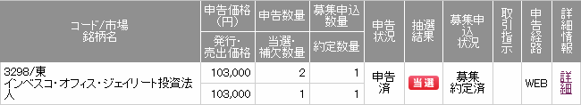 3298インベスコ・オフィス・ジェイリート投資法人のリートIPOに当選しました!