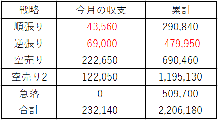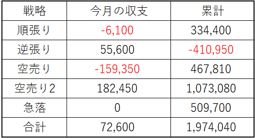 トレードは、順張り、逆張りでマイナスでしたが、空売り勢が活躍してくれ利益を伸ばしてくれています。