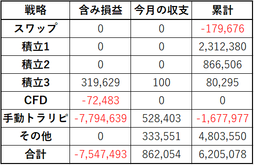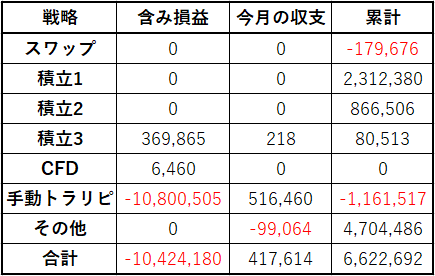 手動トラリピは、過去最大で含み損が膨れ上がっています。結構な額の利益確定もあるにはあるのですが、含み損の額から見れば小さく感じてしまいます。
