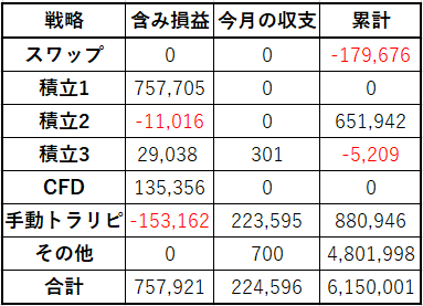 先月に引き続き積立系は、詳細をまとめそびれてしまったので省略します。長らく積立を休んでいた積立1を含め、すべての積立戦略において通貨数を増やしています。