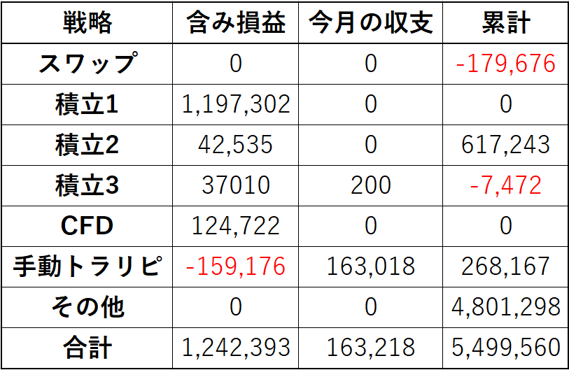 | 戦略 | 含み損益 | 今月の収支 | 累計 |