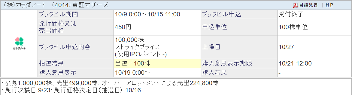 特に4014カラダノートは今年の運を使ってしまう当選だったと思います(^^;)ただ10月中旬ごろから直近上場銘柄が崩れ、初値が思ったより伸びなかったのが残念でした。