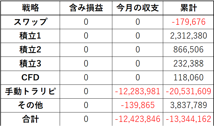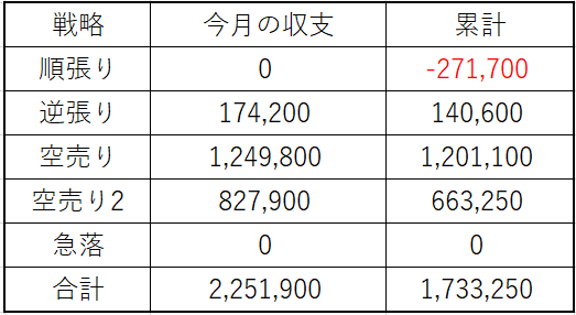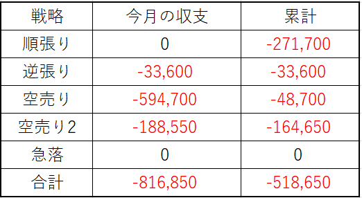 今月の順張りは、勝率が低すぎ(低いのは想定内ですが)、1トレードあたりの損失額が大きく散々な結果でした。