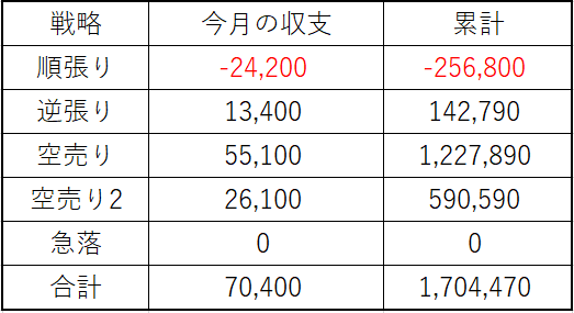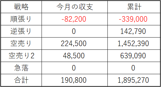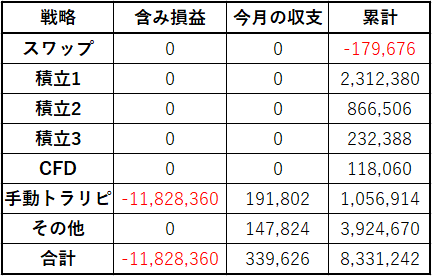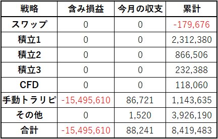 手動トラリピは、先月より若干含み損が減りましたがまだまだきついです。